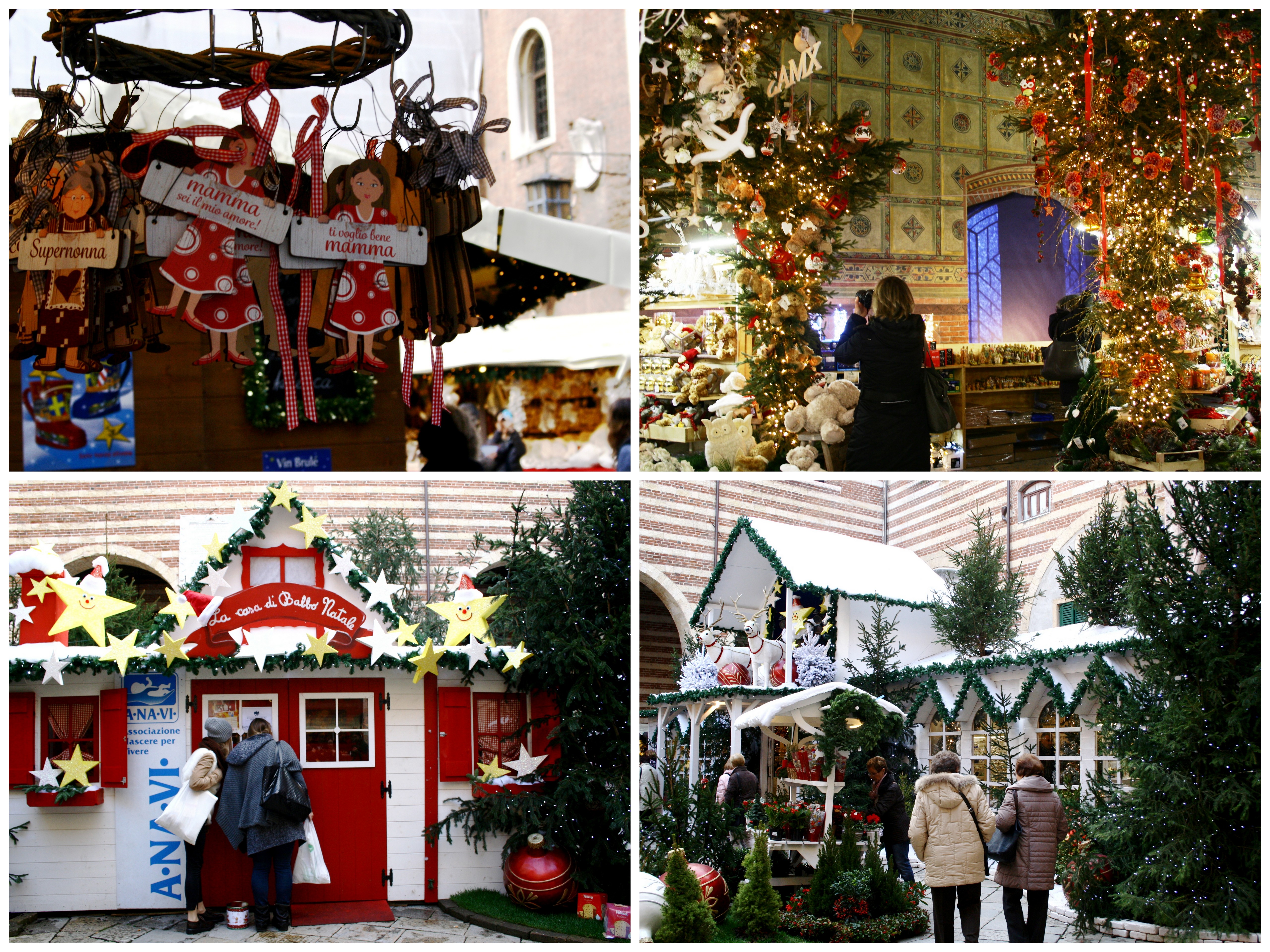 Muszę przyznać, iż nawet tutejszy mercatino jest zupełnie inny i ciekawszy niż wszystkie. Nazywają go Mercatino di Norimberga, gdyż przypomina prawdziwe niemieckie jarmarki świąteczne, a także oferuje ciepły wurst i kapustę, które zachwycają włochów. Składa się z trzech części umieszczonych na Piazza dei Signori (zwanym także Piazza Dante z powodu pomnika Dantego na środku placu). Co go wyróżnia? Bajkowość…Jako że miasto to kojarzy nam się przede wszystkim z Romeem i Julią, pod tą przykrywką, zarabiający na turystach specjaliści, przekonują nas, iż w Weronie wszystko owiane jest legendą i baśniowością. Jak przejawia się to na Mercatino di Natale? Wśród sztucznie utworzonego lasku, przyprószonego tak samo sztucznym śniegiem, znajdziemy La casa di Babbo Natale (Domek Świętego Mikołaja), gdzie dzieci mogą odwiedzić św. Mikołaja we własnej osobie. Natomiast świąteczne pamiątki, zamiast na typowych straganach, dostaniemy w domku rodem z ,,Dziadka do orzechów”. Na środku placu, najbardziej znany i ceniony włoski poeta – oczywiście mowa o Dantem – na czas Bożego Narodzenia trzyma w ręce Vischio (jemiołę), w końcu Werona to przede wszystkim miasto miłości!