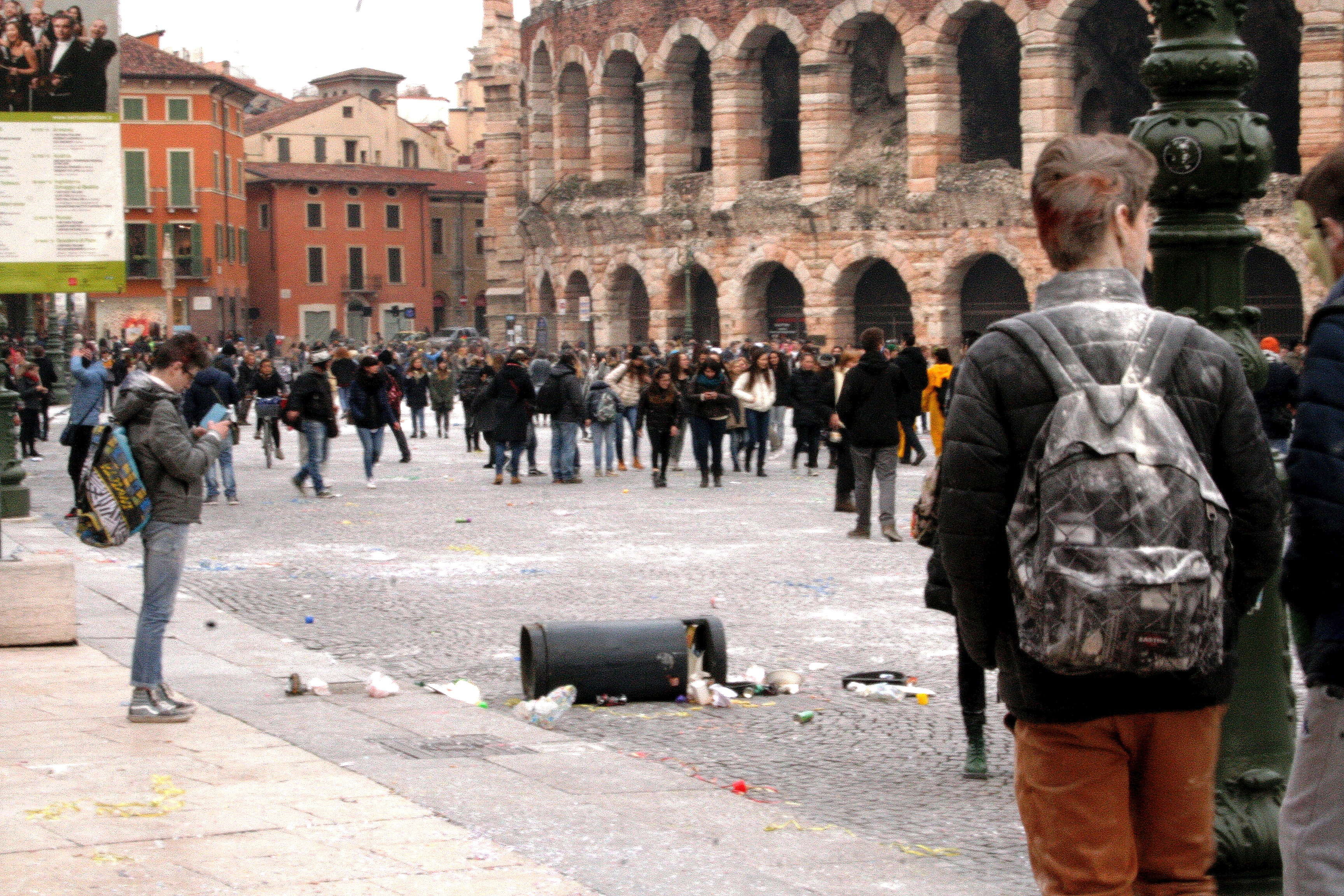 Młodzież gimnazjalna i licealna, która ma wolne od szkoły na ostatnie dni karnawału, tłumnie odwiedziła Piazza Bra’, aby raz w roku bezkarnie zamienić ten piękny rynek w najbardziej zabałaganione miejsce Werony – ich sposobem na świętowanie kluskowego piątku jest obrzucanie się mąką (czasem też jajkami). Pustoszą póki w pobliskich sklepach spożywczych, dostarczając przy okazji dodatkowej roboty ochroniarzom zamiatającym biały, mączny pył sprzed wejść do supermarketów. Piazza Bra’, po wszystkim wyglądał jak pokryty śniegiem.