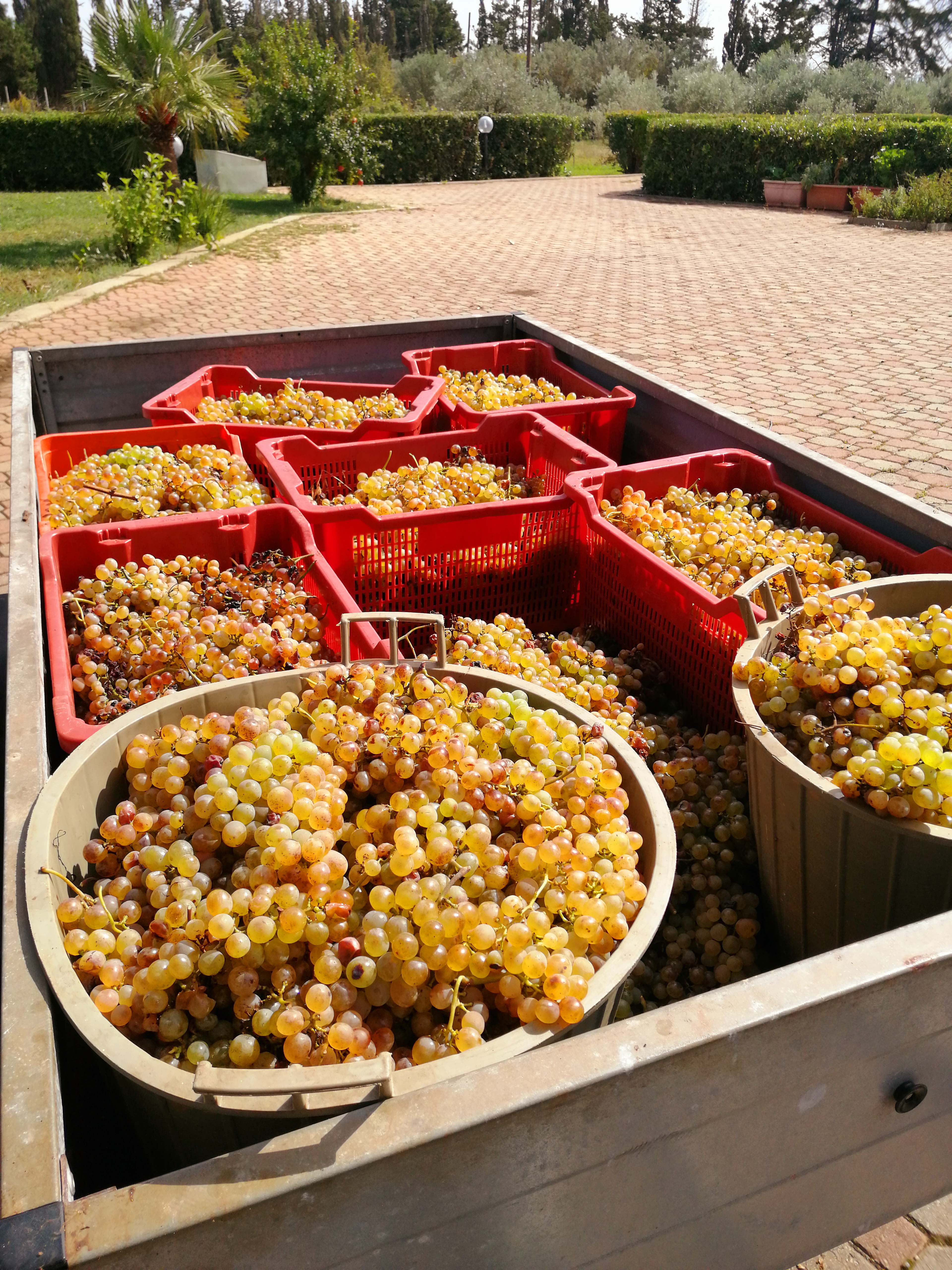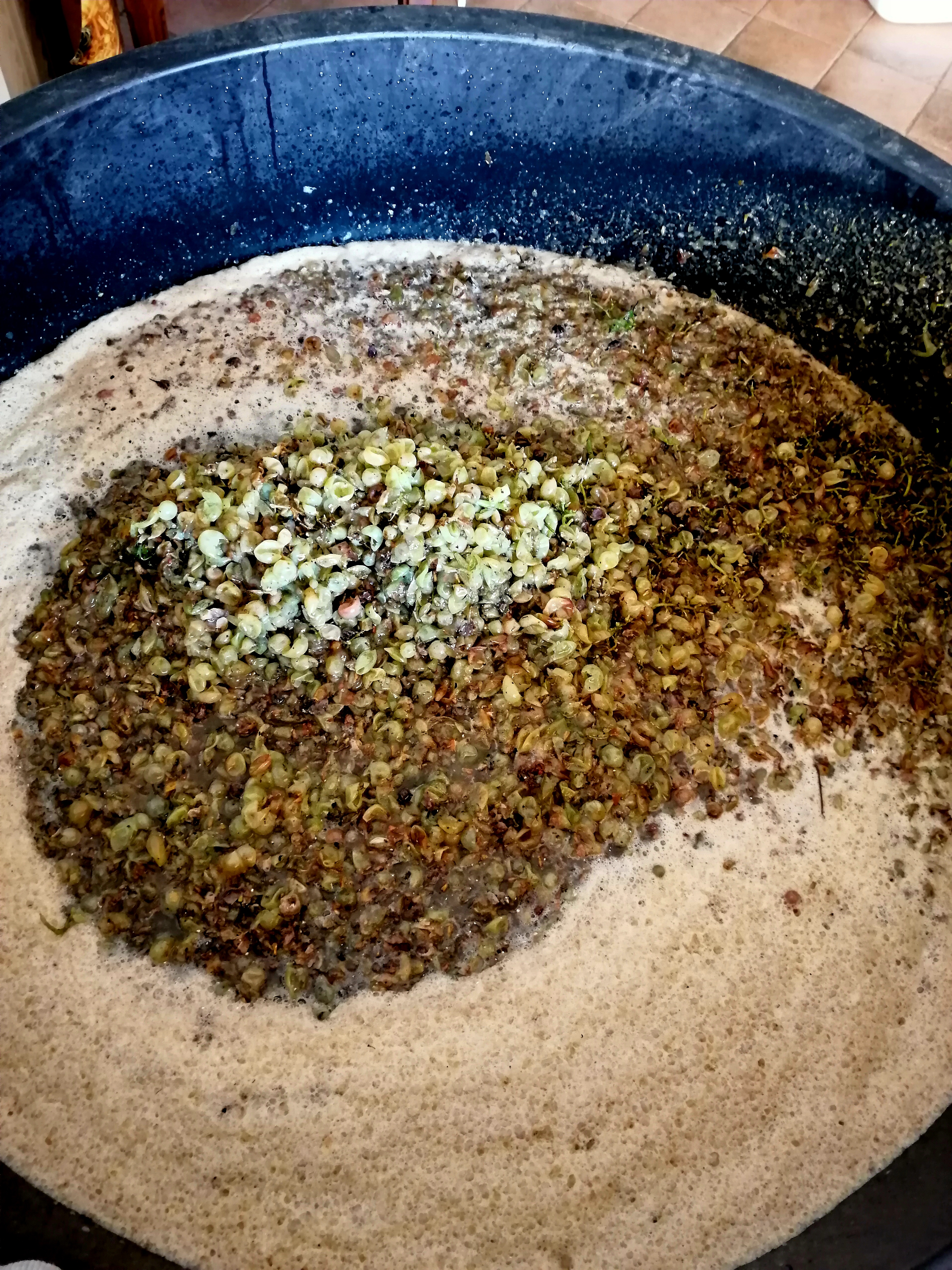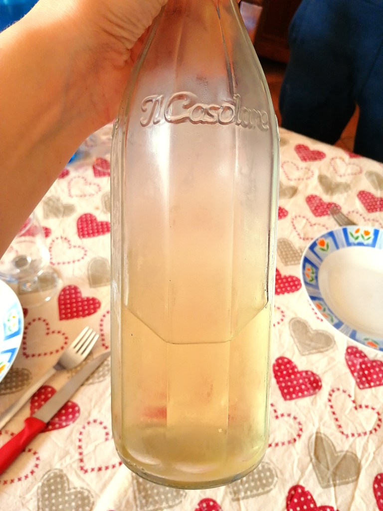 Po tym etapie nie pozostaje nic innego jak zostawienie pojemnika z winogronami i sokiem, który zdążyły wydzielić, na około miesiąc. W kolejnych częściach przygotowywania wina (na początku listopada) niestety nie było nam dane uczestniczyć, bo byliśmy już w Polsce. Uczestniczyliśmy natomiast w tastingu, ponieważ otrzymaliśmy na święta 5 butelek Vermentino od dziadka. Przyznaje, że było przepyszne, bo doprawione dumą, że to właśnie my zbieraliśmy te winogrona. Jak widać na zdjęciach owoce były na tyle dojrzałe, że ich kolor był wręcz bursztynowy i wino przybrało podobny odcień.