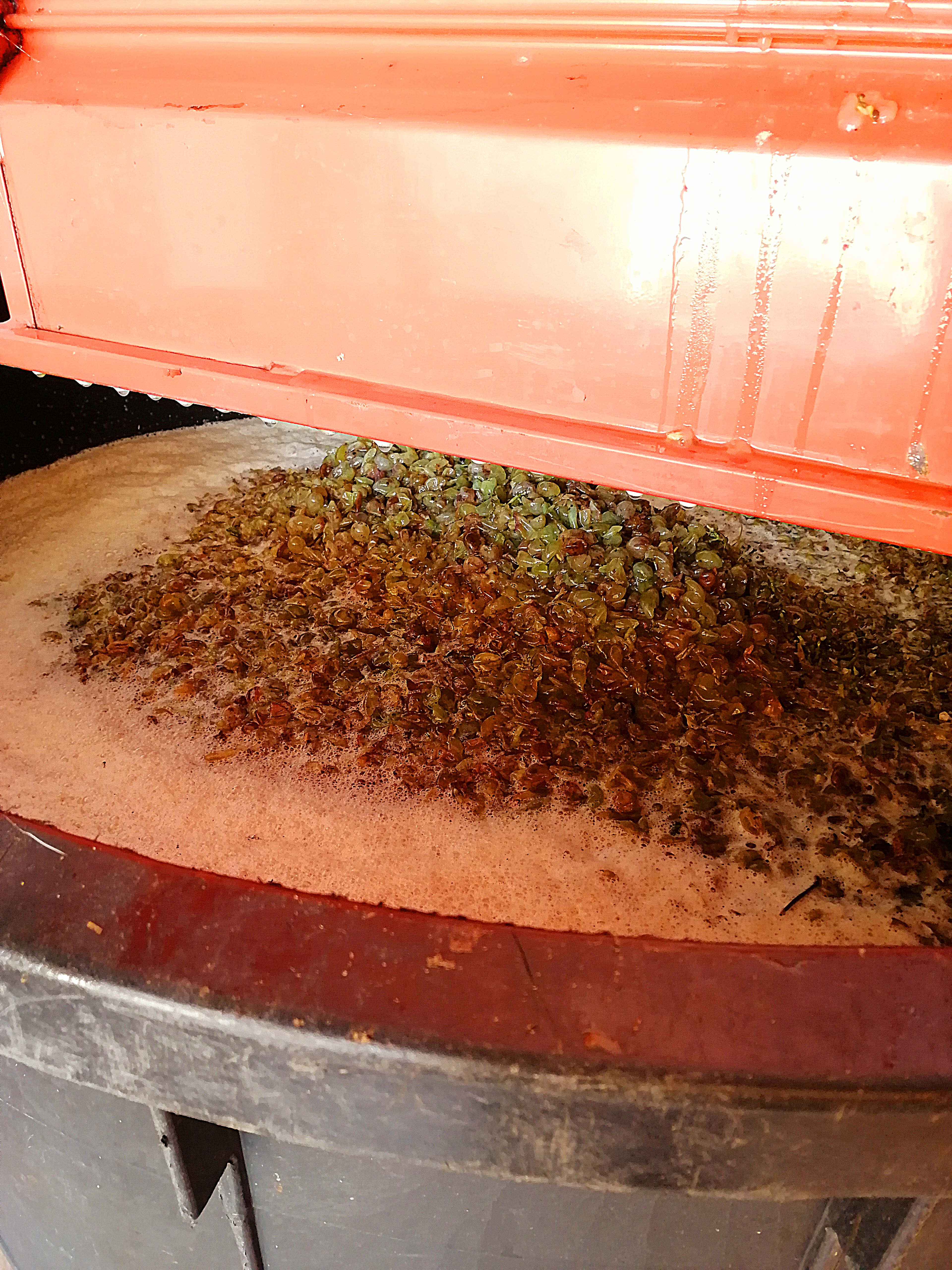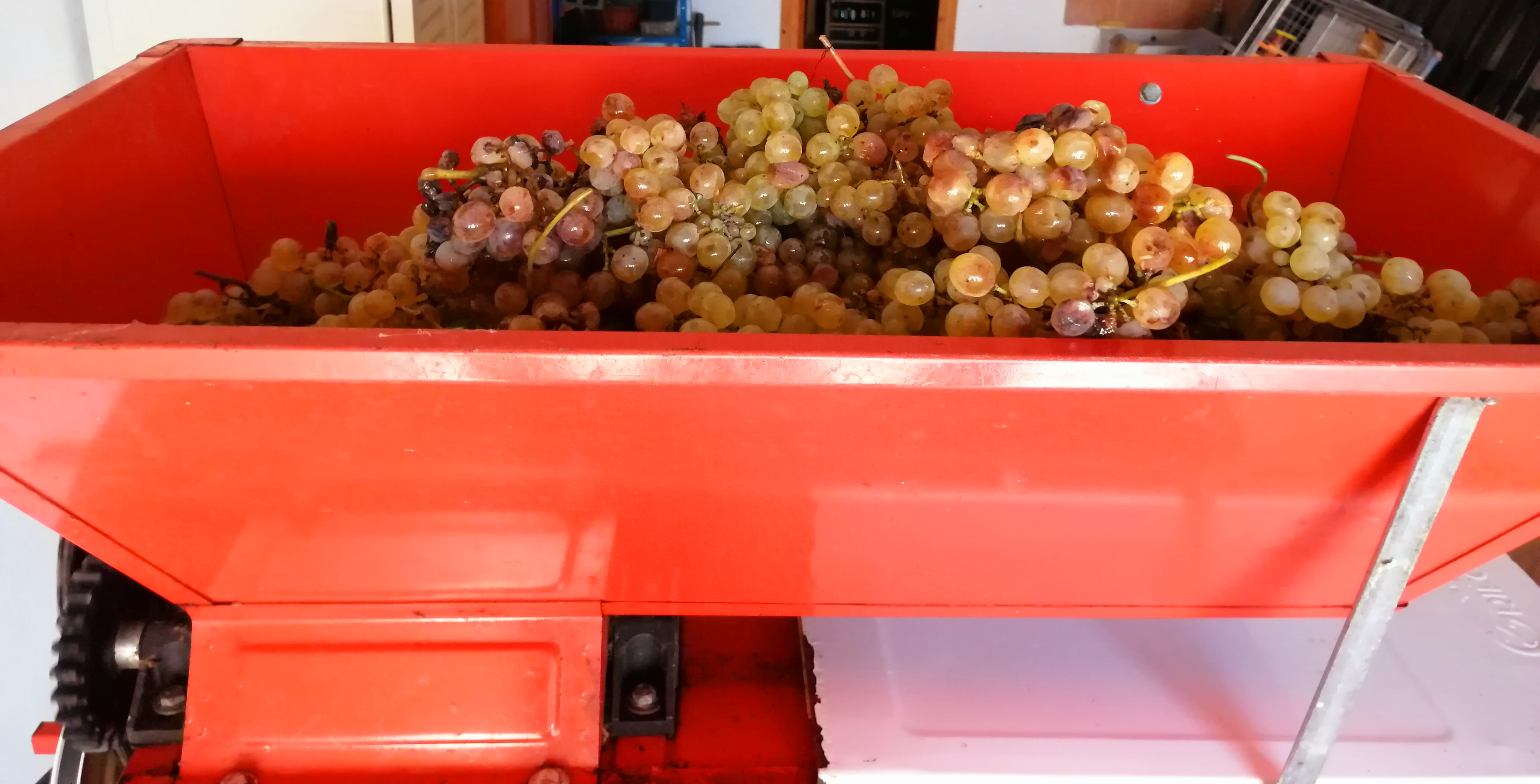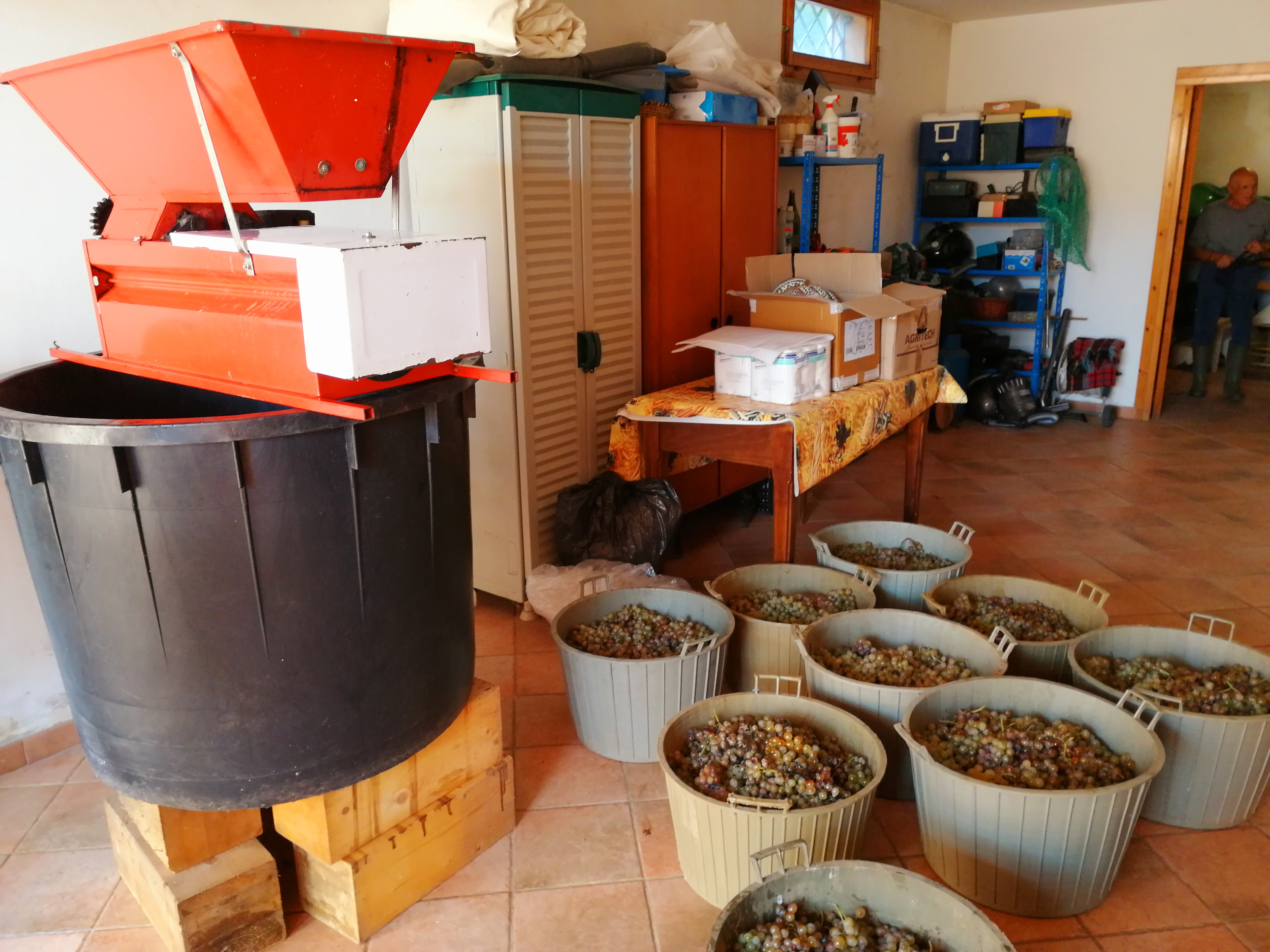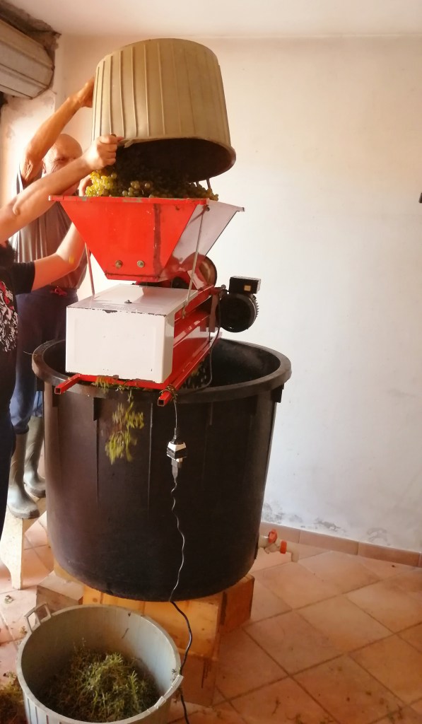 Wróciliśmy do domu po niecałych 2 godzinach z 500 kilogramami niebywale dojrzałych winogron. Babcia czekała już na nas z rozstawionym sprzętem, ponieważ winogrona trzeba jak najszybciej oczyścić i oddzielić owoce od łodyg/trzonów. Na szczęście, robi to za nas maszyna, która nazywa się raspatrice. Składa się z dwóch części – koryta na górze, do którego wrzucamy winogrona i części z siatką przez którą przechodzą winogrona i lądują w ogromym wiadrze. Z boku, do mniejszego pojemnika wpadają odpady. Uwinęliśmy się naprawdę szybko.