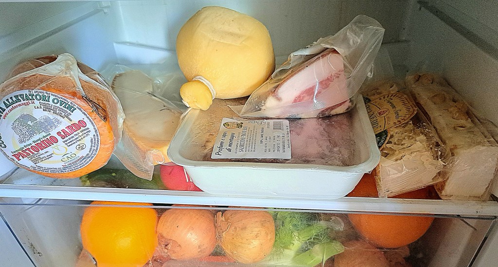 Co do paczki, zamawiana jest w miarę potrzeby, raz na pół roku, czasem rzadziej, ale na pewno jeśli Sardyńczyk nie spędza Świąt w domu, już w listopadzie zamówi przesyłkę z domu. Oczywiście tęsknota za produktami z domu nie dotyka tylko Sardyńczyków. W czasie pandemii we Włoszech powstało kilka firm specjalizujących się w wysyłaniu tego rodzaju boxów, np. Mammapack, gdzie znajdziemy produkty z każdego regionu. Na dowód, że nie rzucam słów na wiatr, udostępniam zdjęcie sardyńskiej półki w naszej lodówce.